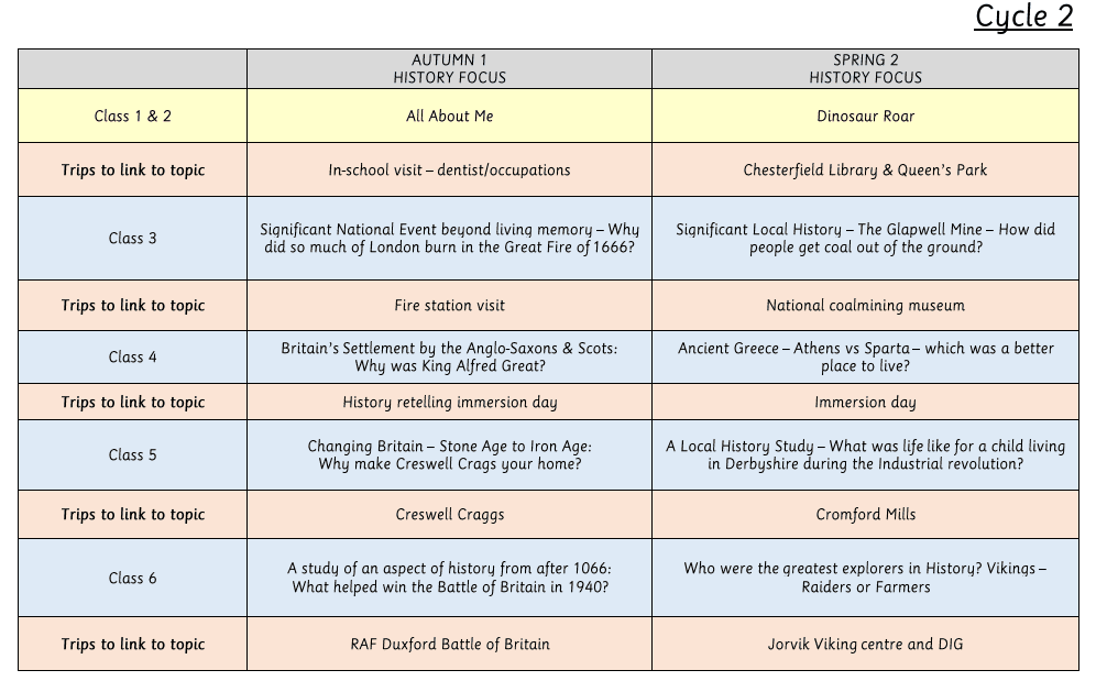 At Bramley Vale, we follow a two yearly plan to ensure the curriculum is fully covered. The outline plan for both Cycle 1 and Cycle 2 is listed below. Each half term, we try to have a school trip or experience linked to our topic for wider learning experiences. If you have any questions about this, please contact the school.